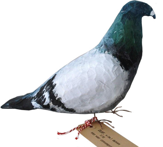 Duiven Ontroerend mooie duiven op ware grootte van geschilderd papiermaché. Ze worden met hart en ziel gemaakt door Patrice Aarts. Sinds ik er één heb, wil ik een hele zwerm. Na bestelling komt de duif per post naar je toe. Er zijn slechts 16 genummerde exemplaren beschikbaar Prijs: € 32,50 per stuk Bestellen: stuur een e-mail |