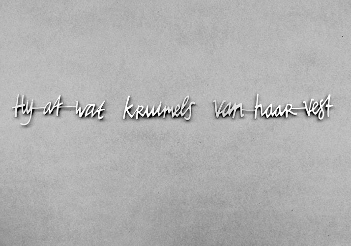 Terloopse zin Ik verkoop zinnen van zink. Een jaar lang spaarde ik 'Terloopse zinnen': zinnen die terloops door mensen worden uitgesproken, maar zoveel zeggen over degene die ze zegt. De zinnen komen overal vandaan. Ze zijn opgevangen op straat en genoteerd tijdens lange telefoongesprekken. Zinnen die zijn overgebleven uit afgeluisterde conversaties in de trein, snel opgeschreven tijdens recepties en verjaardagen of terloops gehoord tijdens wandelingen door de stad met mijn hond. Een overzicht van al mijn zinnen vindt u hier, maar ik zaag ook zinnen of iemands gevleugelde uitspraak in opdracht. De zinnen zijn geprijsd vanaf 275 euro. Prijs 'Hij at wat kruimels van haar vest': € 275 Bestellen: stuur een e-mail |