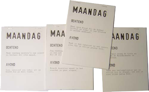 alledaagse geluksweek Vier verschillende weekprogramma’s voor een alledaagse geluksweek. Per stuk te koop voor 10 euro, maar als je ze alle vier bestelt, wat dus inhoudt dat je een máándlang gegarandeerd bent van alledaags geluk bij het opvolgen van de opdrachten, betaal je 35 euro. Als me dat toch geen goeie aanbieding is... Ik zou het wel weten. Grijp uw kans. Uw bestelling ligt zo snel mogelijk bij u in de bus. Prijs per stuk: € 10 Prijs per vier: € 35,- Bestellen: stuur een e-mail |