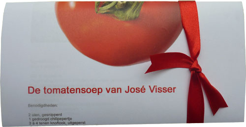 recepten Niet zómaar vijf recepten, nee: súperrecepten. Van die recepten waarvan je denkt: 'Die zou ik even moeten vragen' als je bij iemand eet, maar dat dan weer vergeet. Ik heb mijn vriendinnen speciaal voor jullie gevraagd naar hun allerbeste. De tomatensoep van José Visser bijvoorbeeld is niet zómaar een tomatensoep, dat is een soep om gek van te worden. Recepten die je levensgeluk vergroten. Zo ook de 'Couscoussalade van Ansepans', het recept van de 'Koekjes tegen verdriet' van Marguerite en nog twee hele goeie geheime recepten die je pas ziet als je ze bestelt. Prijs: € 7,50 (voor vijf recepten) Bestellen: stuur een e-mail |