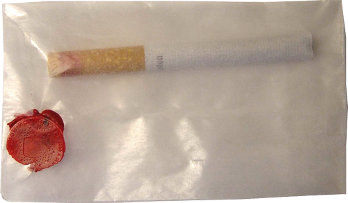 Eén sigaretje Als ik een echt winkeltje zou hebben met een toonbank, dan zou ik er ook sigaretten per stuk verkopen. Voor af en toe. Niet gelijk een pakje, maar geluk in het klein. Op de sigaret zit trouwens alvast een rode lippenstiftafdruk, omdat die altijd zo mooi zijn en er hele verhalen te vertellen zijn over de persoon die die afdruk heeft achtergelaten en wat ze heeft gezegd terwijl ze de sigaret rookte en of ze er hard bij huilde enzo. Iedereen zou altijd één sigaretje in zijn tas moeten hebben zitten, mèt vuur, of je nou zelf rookt of niet. Om vrolijk onverwacht aan te bieden, om in noodgevallen op te roken, of om steeds naar te kijken en jezelf op de borst te slaan omdat het zo knap is dat je 'm nog steeds niet hebt aangeraakt. Prijs: € 2,- Bestellen: stuur een e-mail |