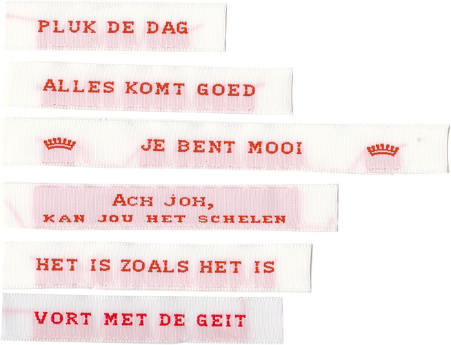 Tekstlabels Kleine teksten om achterin je kleding te naaien, of in je tas, of aan de binnenkant van je handschoenen. Ook fijn in kinderkleding. - Pluk de dag (4,5 cm lang) - Alles komt goed (6 cm lang) - Je bent mooi (9 cm met kroontjes aan beide zijden) - Ach joh, kan jou het schelen (7 cm lang) - Het is zoals het is (6 cm lang) - Vort met de geit (6 cm lang) Alle labels zijn 1 cm. breed. Prijs: zes voor € 10,-, € 2,- per stuk Bestellen: stuur een e-mail |