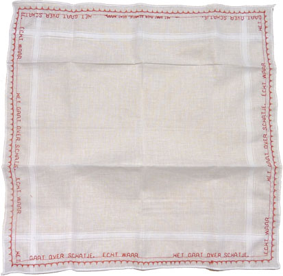 Troostzakdoek Een zakdoek in je tas met een gezellig geborduurd randje en een bemoedigende tekst die troost, zoals bijvoorbeeld: 'Het gaat over schatje, echt waar'. Maar ik heb ze ook met: 'Morgen ziet alles er alweer heel anders uit, daar kun je donder op zeggen'. Formaat van de zakdoek is 36 x 36 cm. Prijs: € 15,- per stuk Bestellen: stuur een e-mail |